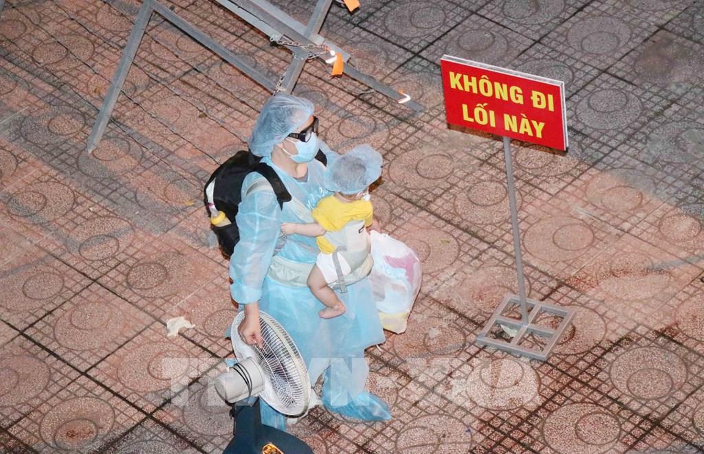 Cháu bé được mẹ bế chờ làm thủ tục nhận phòng trong đêm 11/7. Ảnh: Xuân Khu-TTXVN
