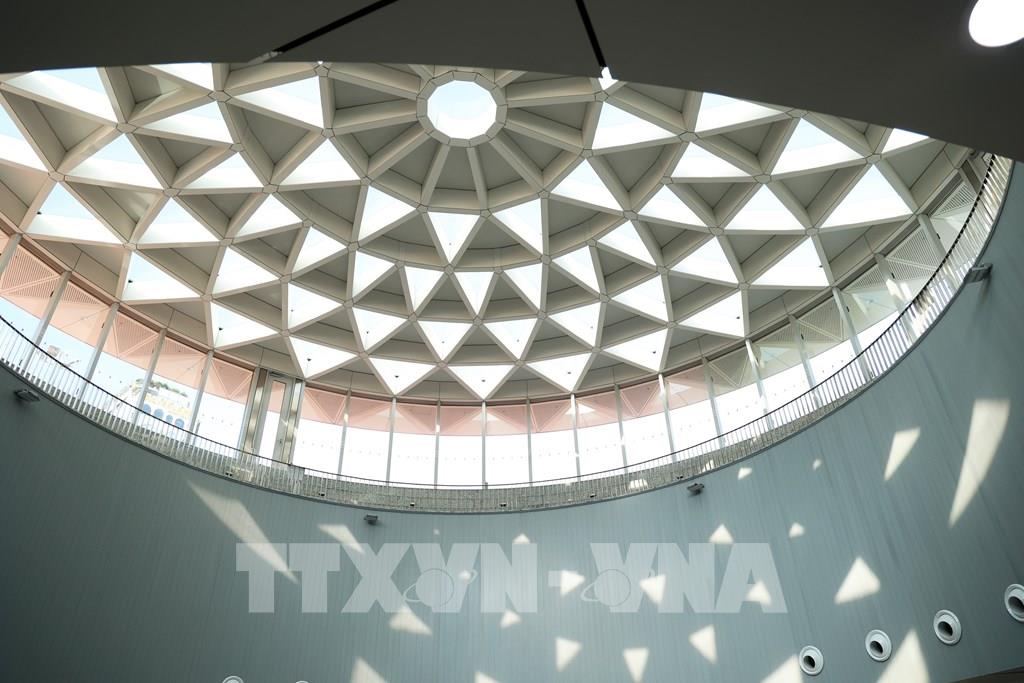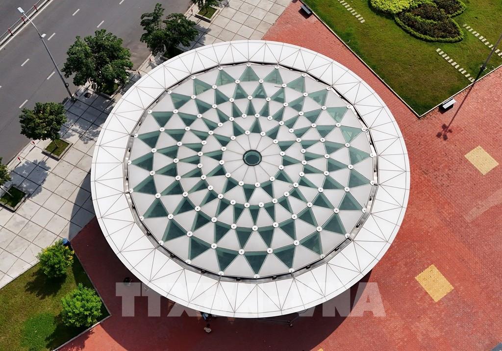 Giếng trời được thiết kế với phối cảnh nhìn từ trên xuống có hình hoa sen, được đan xen bởi hai vật liệu chính: kính và tấm nhôm tổ ong với phần lớn các vật liệu nhập khẩu trực tiếp từ Nhật Bản có khả năng chống chịu thời tiết tốt, cách nhiệt vượt trội. Ảnh: Hồng Đạt - TTXVN