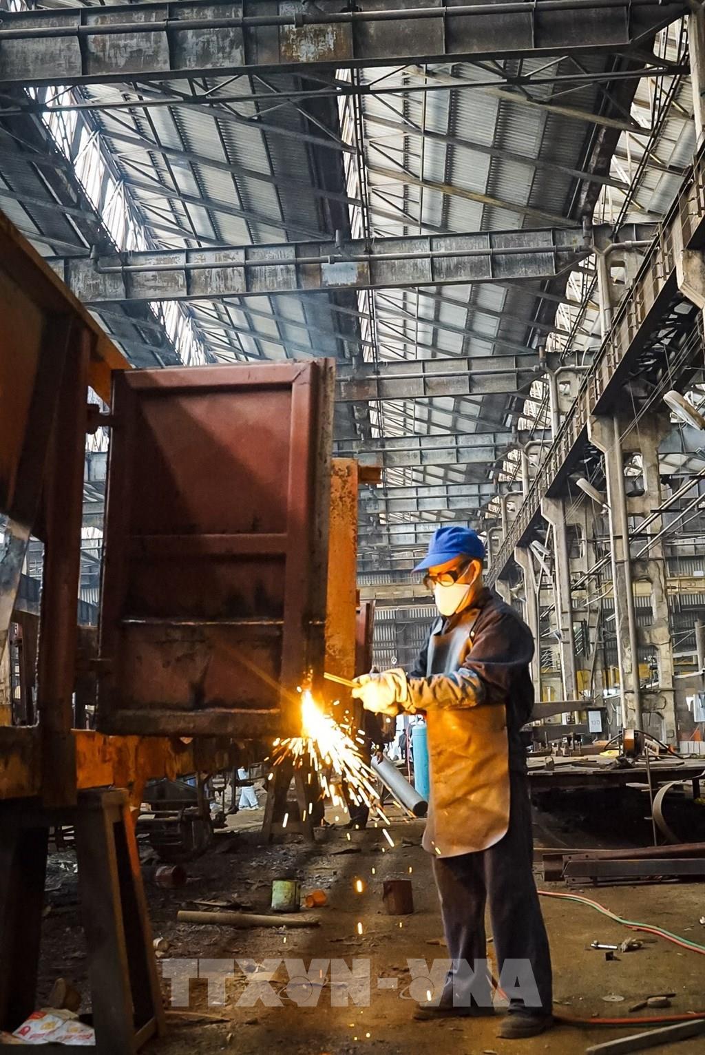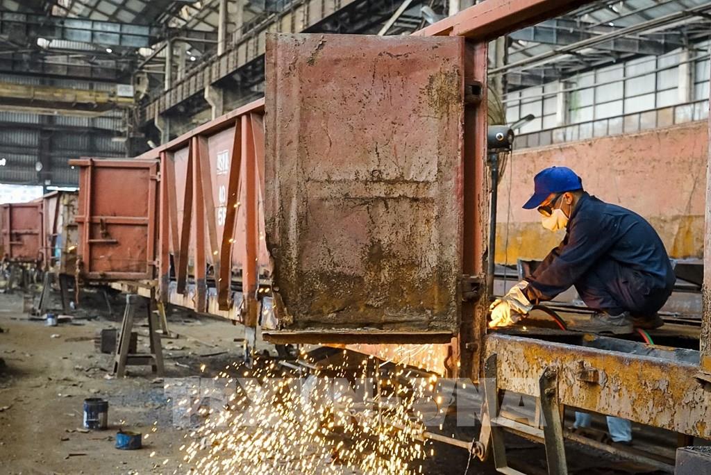 Các hoạt động sửa chữa, sản xuất của công nhân trong nhà máy xe lửa Gia Lâm. Ảnh: Khánh Hoà - TTXVN