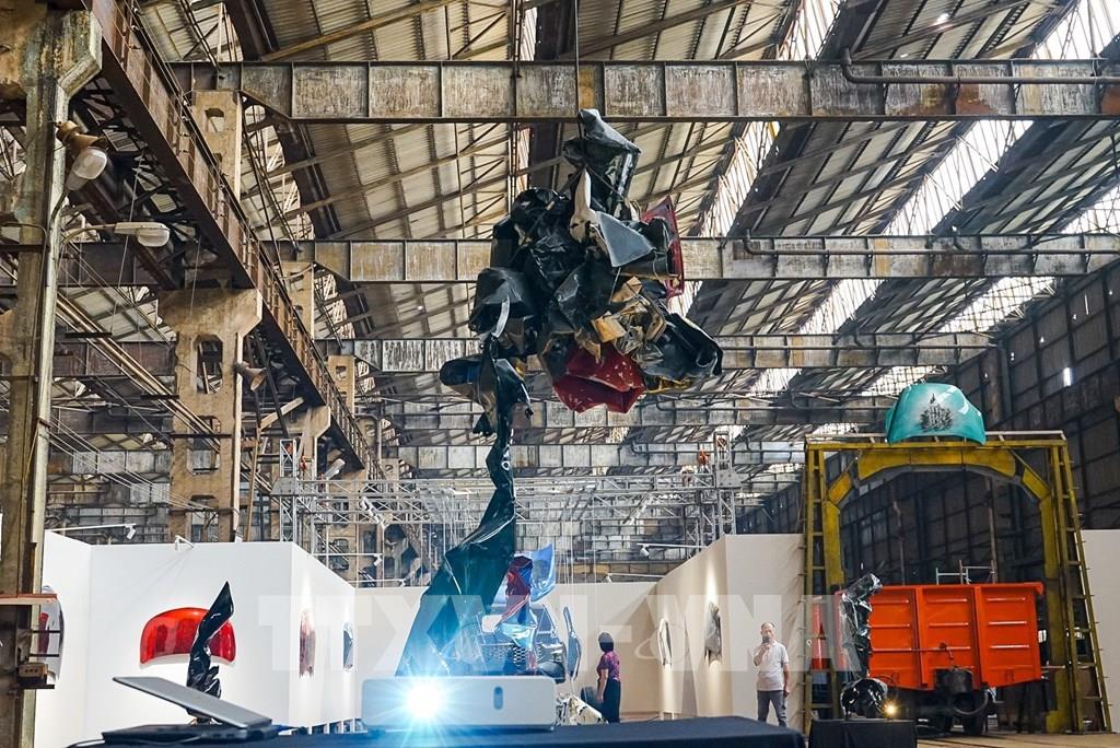 Một tác phẩm nghệ thuật được họa sĩ sáng tác tại Nhà máy xe lửa Gia Lâm. Ảnh: Khánh Hoà - TTXVN