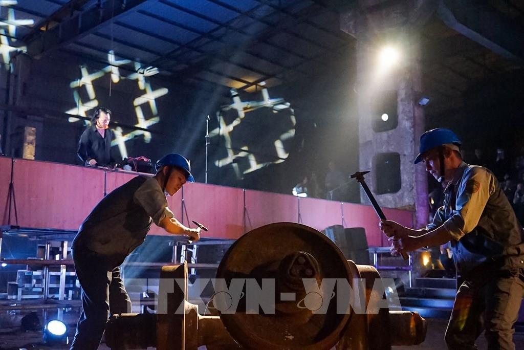Một số diễn viên trong tác phẩm nghệ thuật "Âm cảnh ga Hà Nội" tại phân xưởng nóng của Nhà máy xe lửa Gia Lâm. Ảnh: Khánh Hoà - TTXVN