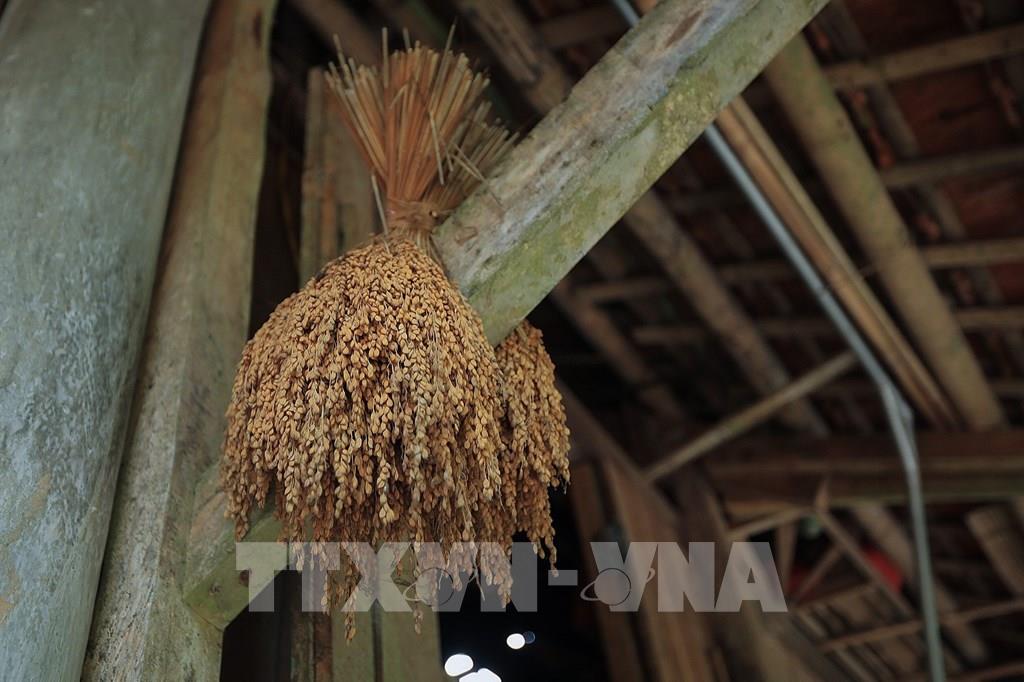 Bó lúa mùa thu hoạch trước được người dân lưu trữ bên hiên nhà sàn. Ảnh: Trọng Đạt-TTXVN