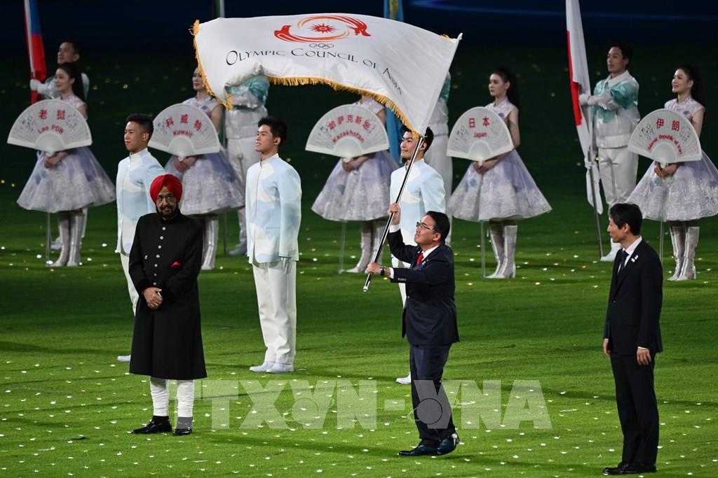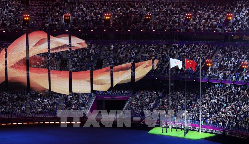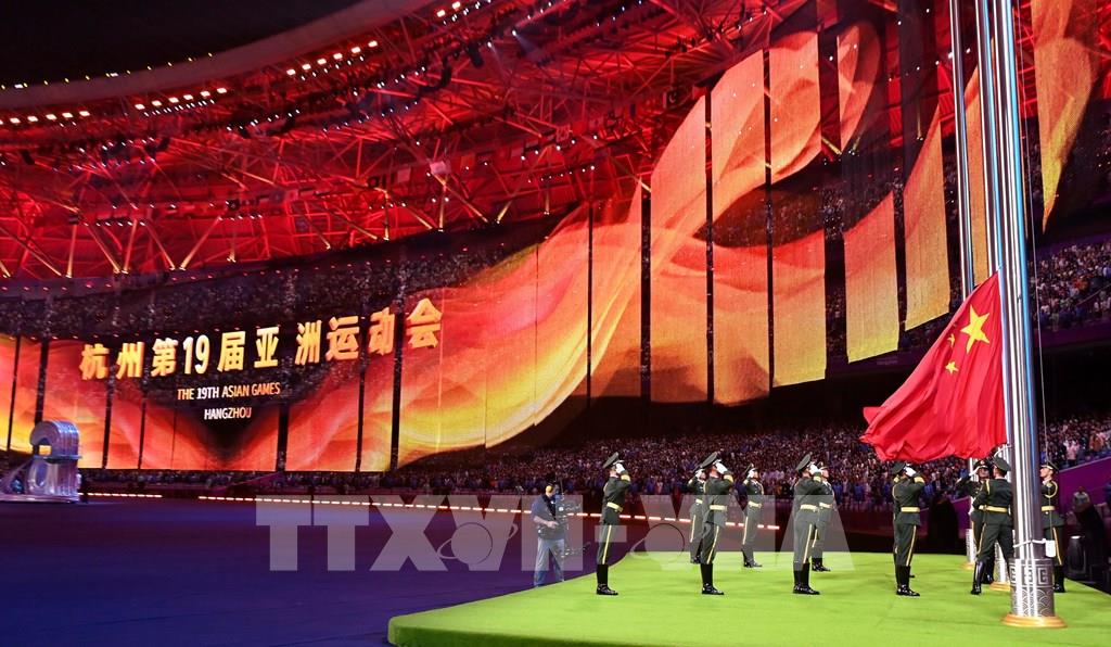 Nghi thức thượng cờ Trung Quốc tại lễ bế mạc ASIAD 2023 trên sân vận động Olympic Hàng Châu. Ảnh: THX/TTXVN