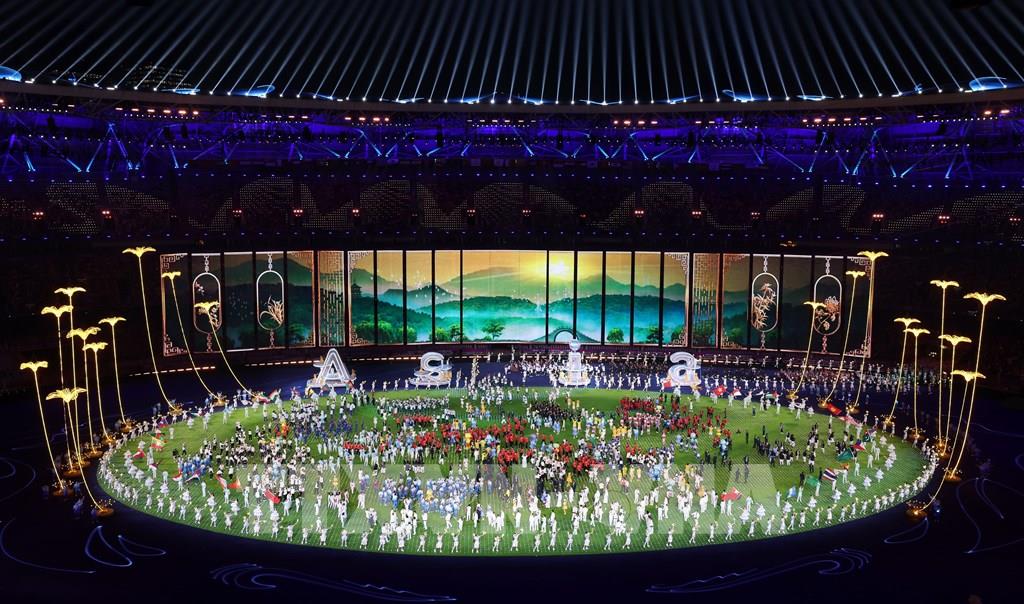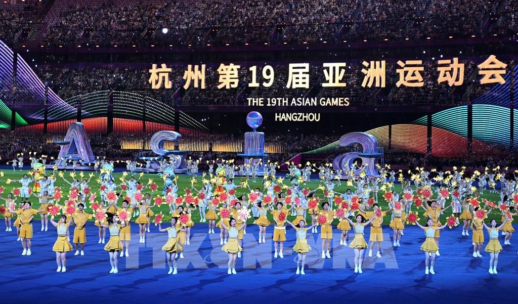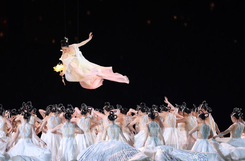 Tiết mục biểu diễn nghệ thuật đặc sắc tại lễ bế mạc ASIAD 2023 trên sân vận động Olympic Hàng Châu tối 8/10/2023. Ảnh: THX/TTXVN