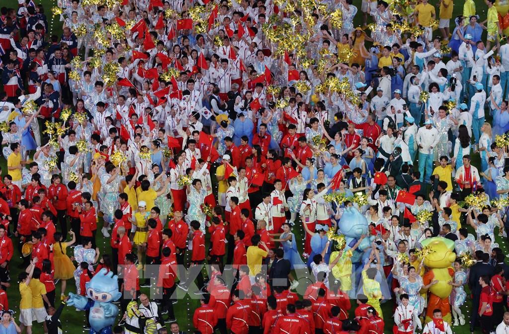 Các đoàn thể thao diễu hành vào sân vận động Olympic Hàng Châu trong lễ bế mạc ASIAD 2023. Ảnh: THX/TTXVN
