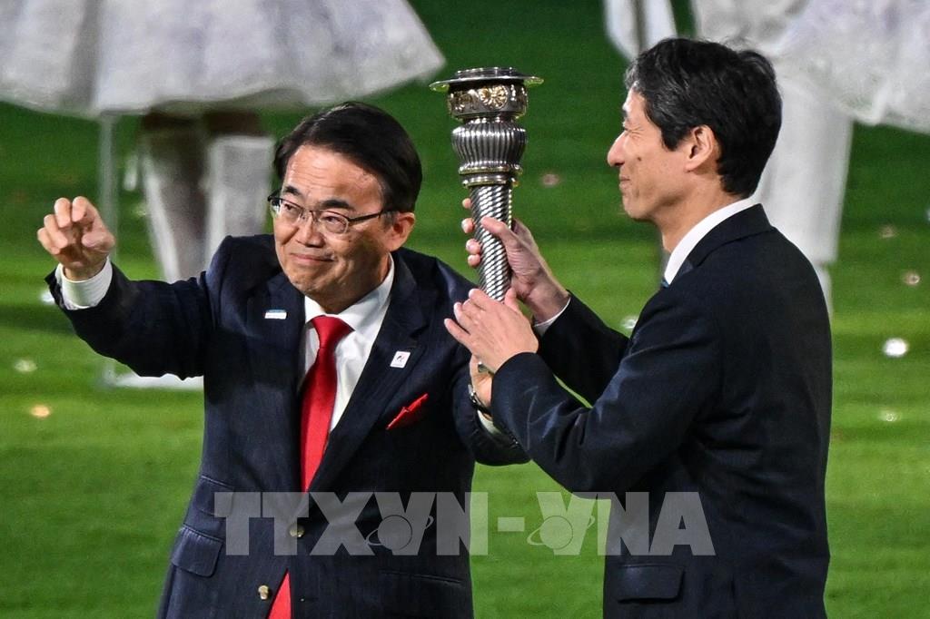 Đại diện của Nhật Bản - chủ nhà ASIAD 20 - nhận chuyển giao ngọn đuốc tại lễ bế mạc. Ảnh: AFP/TTXVN