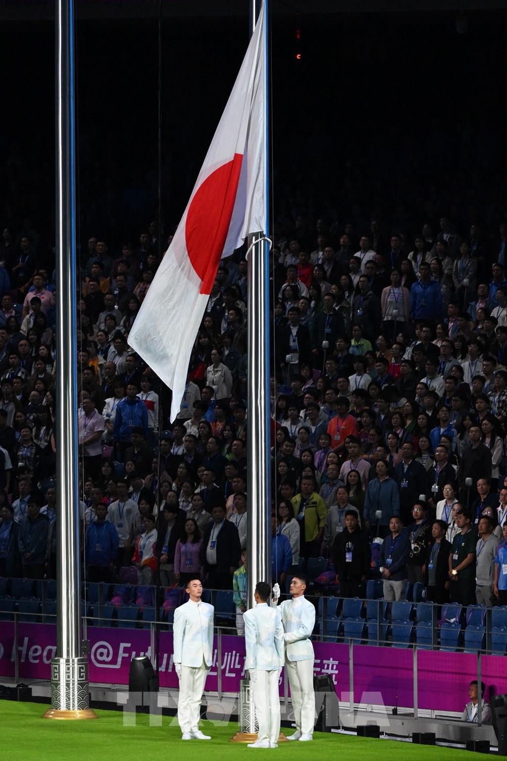 Lá cờ Nhật Bản được kéo lên cao sau nghi thức đại diện nước này đón quyền chủ nhà ASIAD 20. Ảnh: AFP/TTXVN