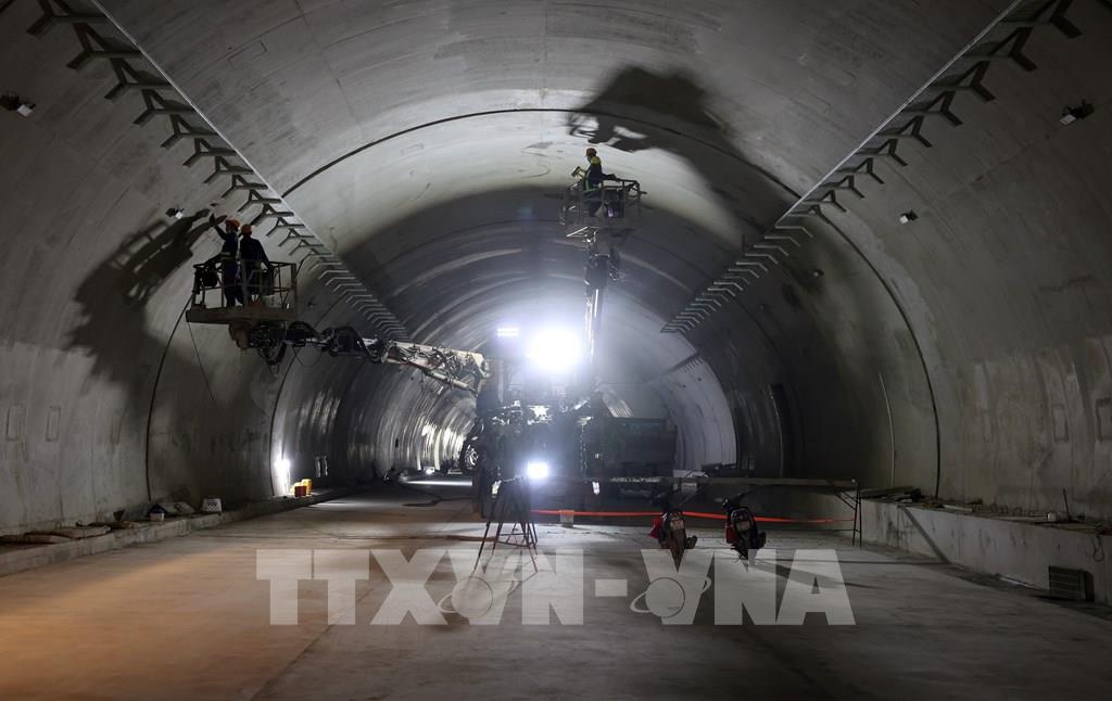 Nhà thầu triển khai lắp đặt hệ thống cơ điện, điện chiếu sáng trong ống hầm 2 của hầm Tuy An. Ảnh: Quốc Khánh - TTXVN