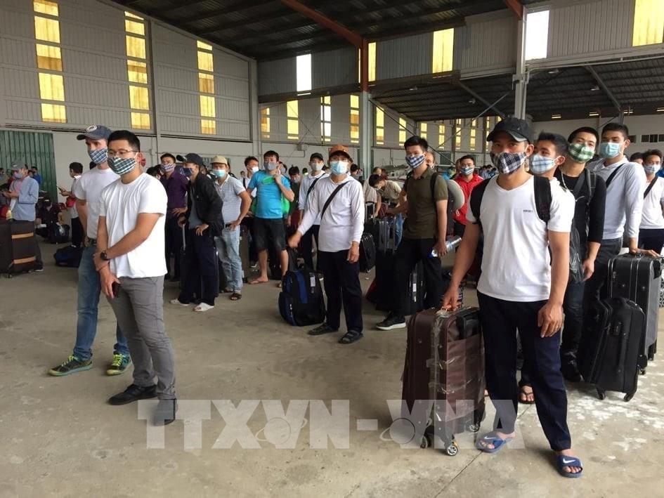 Lao động Việt Nam tập trung chuẩn bị hành lý lên máy bay về nước. Ảnh: Đình Lượng - TTXVN