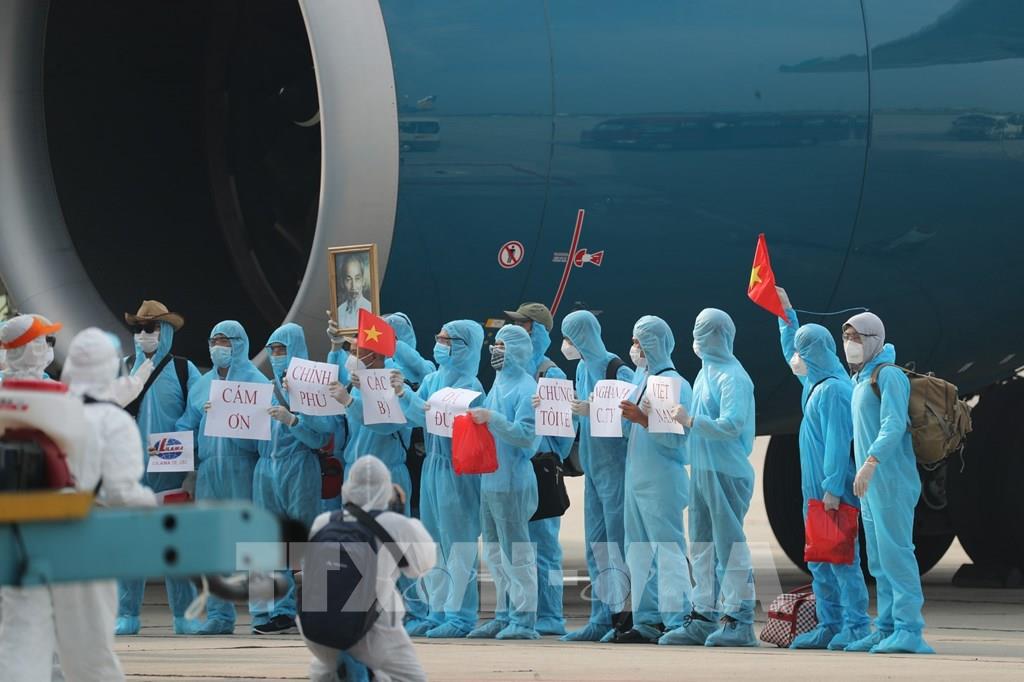 Các công dân trên chuyến bay của Hãng Hàng không Việt Nam (Vietnam Airlines) mang số hiệu VN6. Ảnh: TTXVN phát