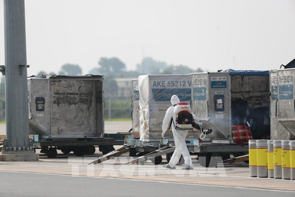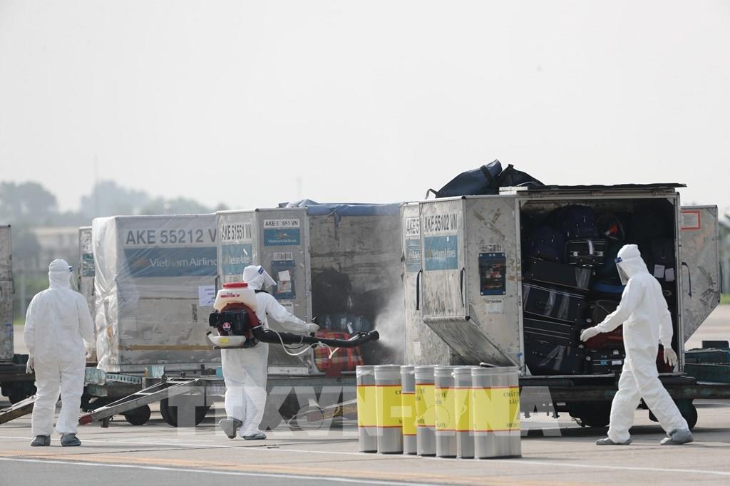 Toàn bộ hành lý của chuyến bay được phun khử trùng ngay khi chuyển ra khỏi máy bay. Ảnh: Thành Đạt - TTXVN