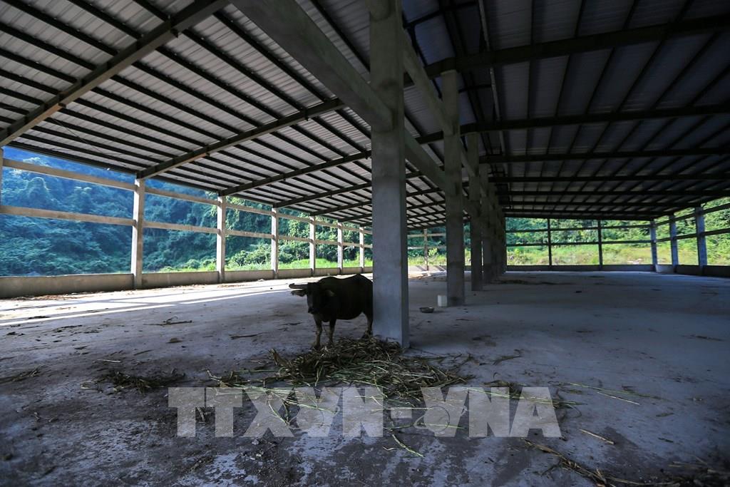 Hệ thống nhà xưởng, đế bê tông hệ thống xử lý và đế bê tông lò chịu tải... của dự án được xây dựng kiên cố nhưng đã trở thành điểm nuôi thả trâu bò của người dân địa phương. Ảnh: Trọng Đạt-TTXVN