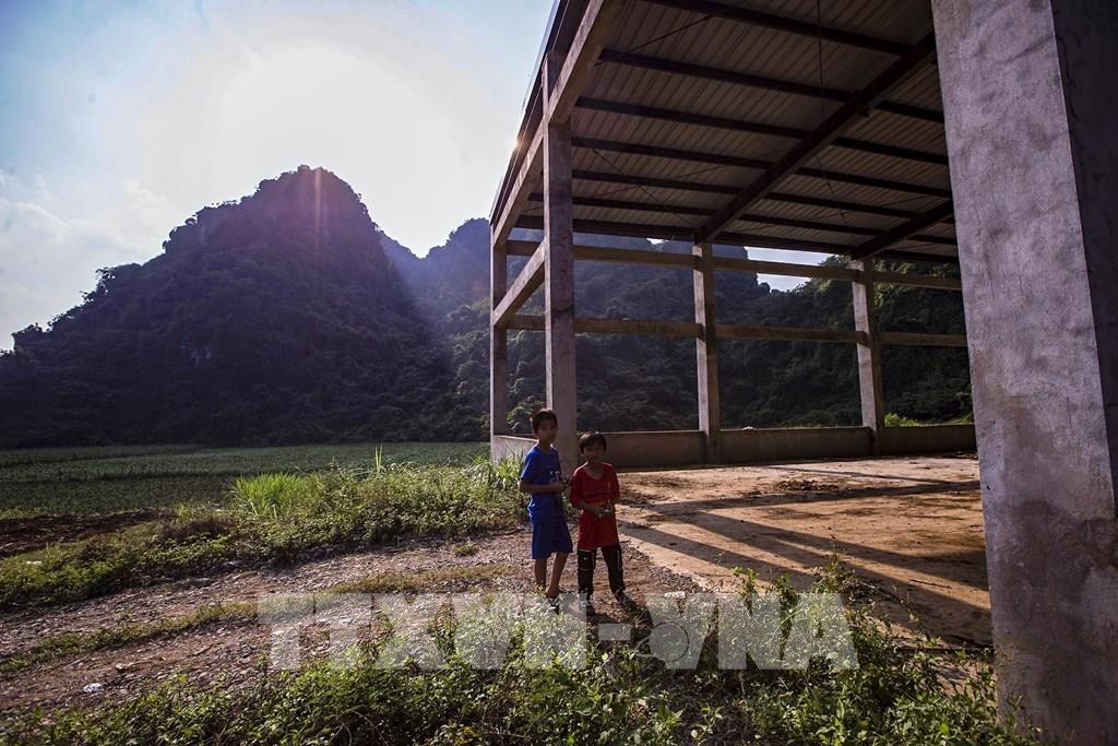 Những cậu bé chơi ở phía trước lối ra vào nhà xưởng bỏ hoang của dự án mô hình Khu xử lý chất thải rắn quy mô liên xã huyện Yên Thủy. Ảnh: Trọng Đạt-TTXVN