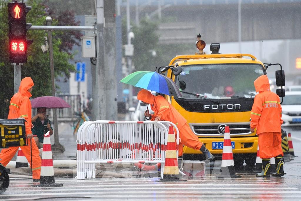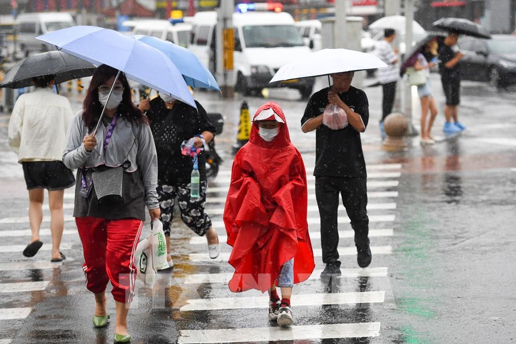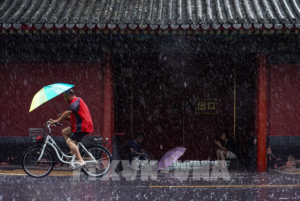 Người dân di chuyển trên đường phố dưới trời mưa tại Bắc Kinh, Trung Quốc, ngày 30/7/2023. Ảnh: THX/TTXVN