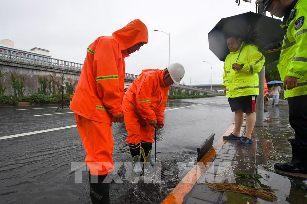 Kiểm tra cống thoát nước để tránh ngập lụt tại Bắc Kinh, Trung Quốc, ngày 30/7/2023. Ảnh: THX/TTXVN