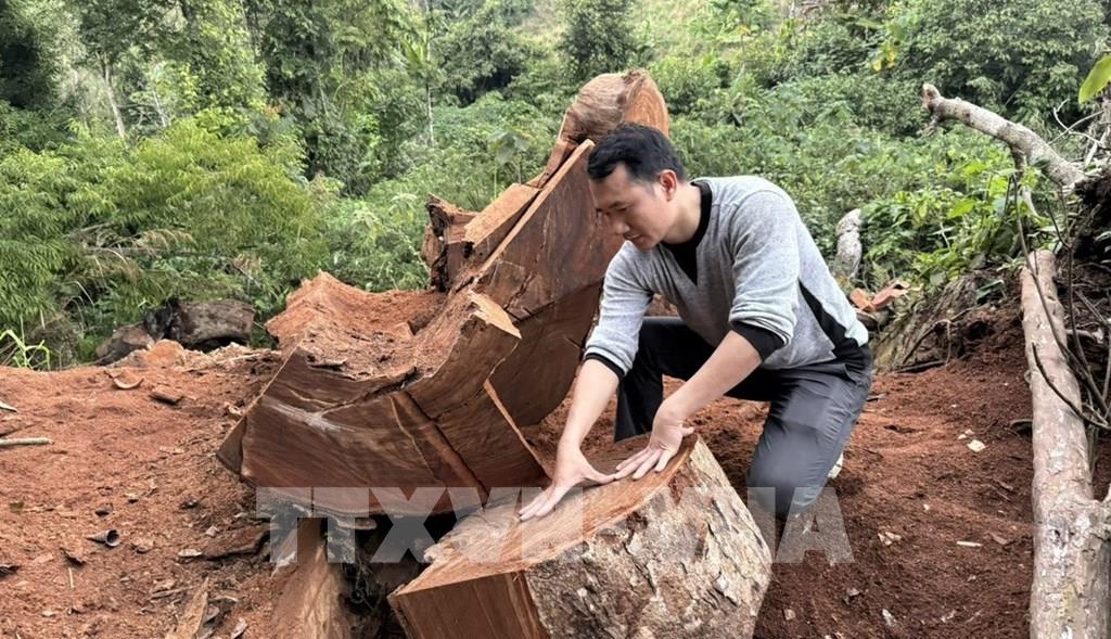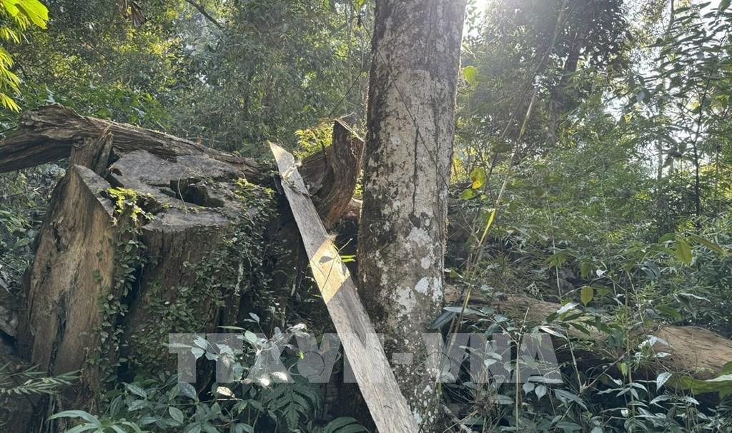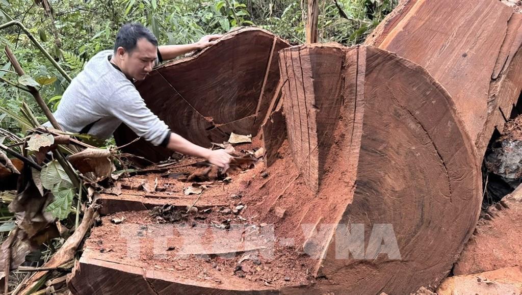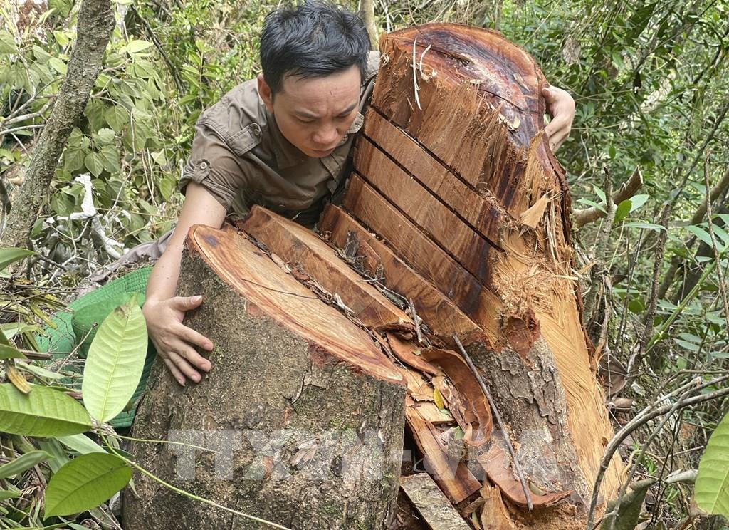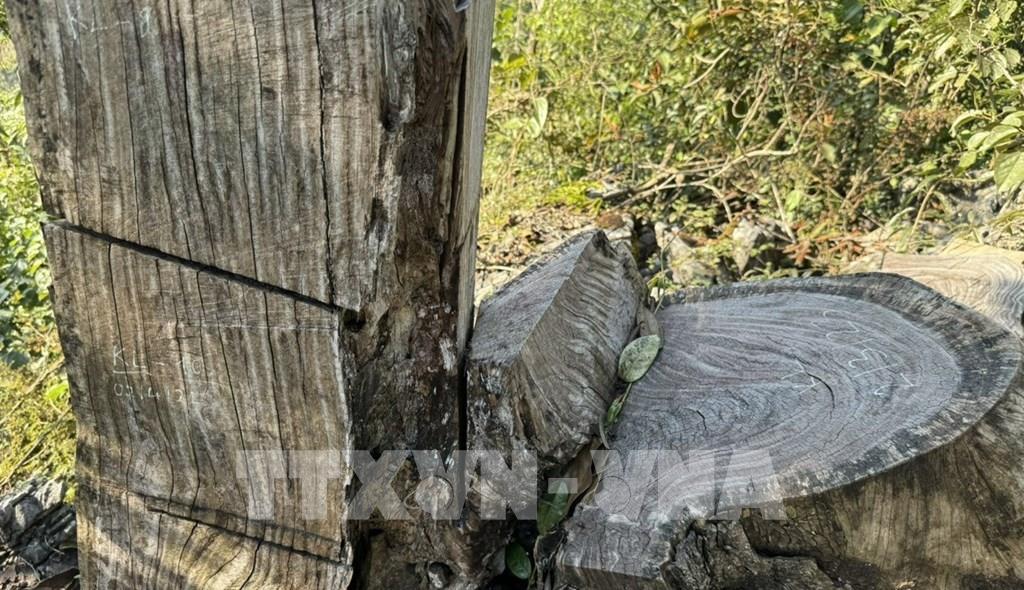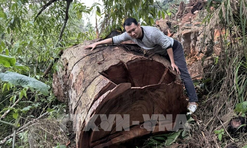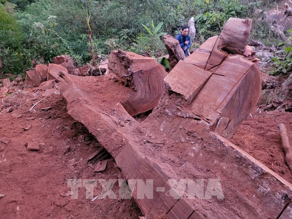 Những cây gỗ nghiến to tới 3 người ôm bị các đối tượng đốn hạ tại bản Séo Lèng 2, xã Phìn Hồ, huyện Sìn Hồ. Ảnh: Nhóm phóng viên TTXVN
