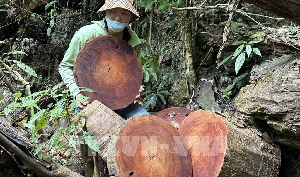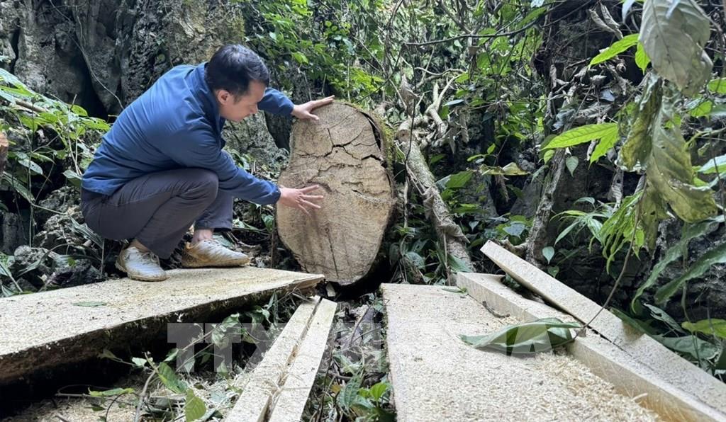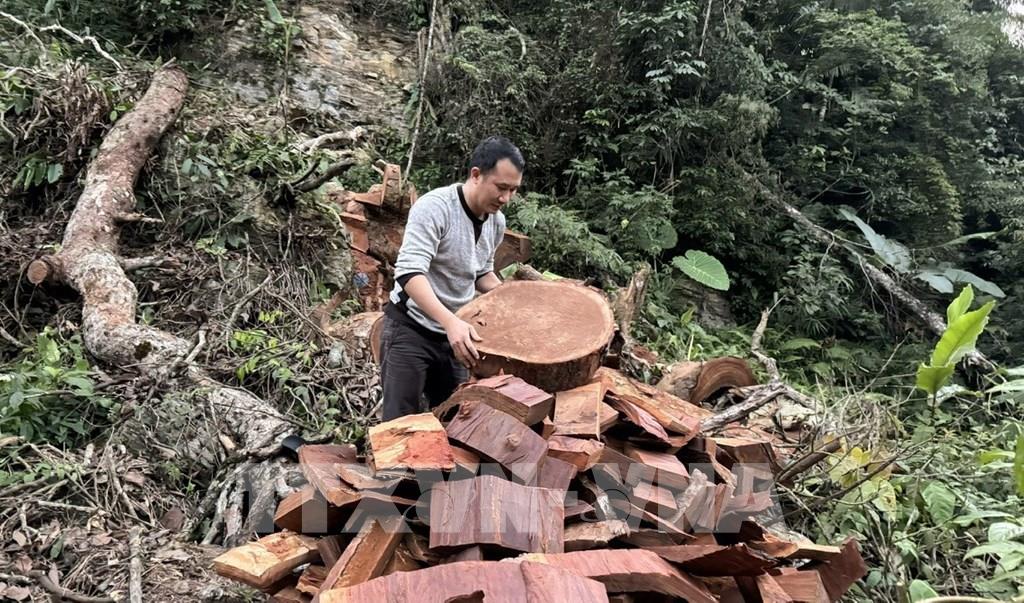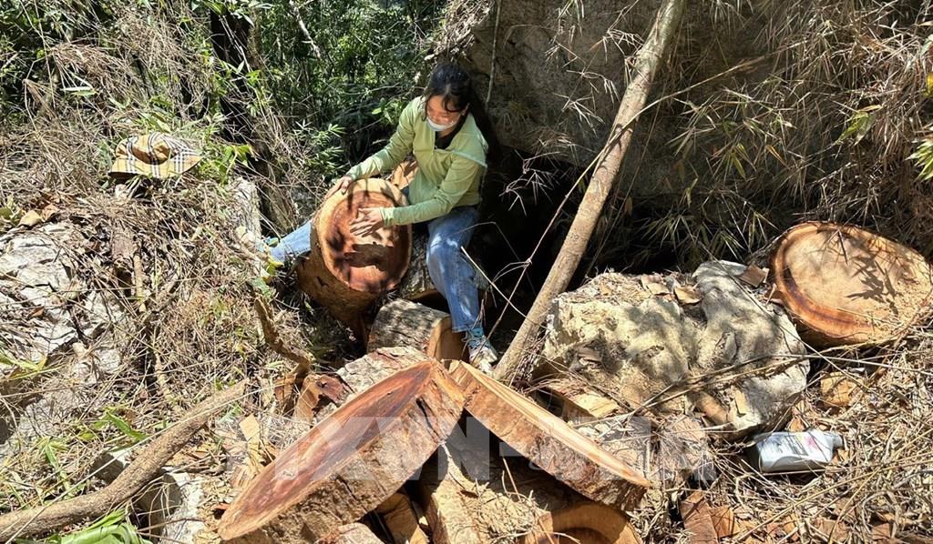 Nhiều khúc gỗ nghiến lớn ở rừng phòng hộ bản Séo Lèng 2, xã Phìn Hồ mà "lâm tặc" chưa kịp vận chuyển đi tiêu thụ. Ảnh: Nhóm phóng viên TTXVN