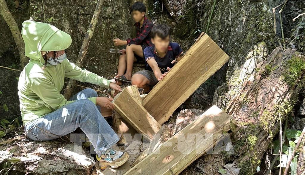 Người dân bị các các đối tượng “đầu nậu” lợi dụng hoàn cảnh khó khăn để thuê vào rừng cắt hạ cây gỗ nghiến. Ảnh: Nháóm phóng viên TTXVN