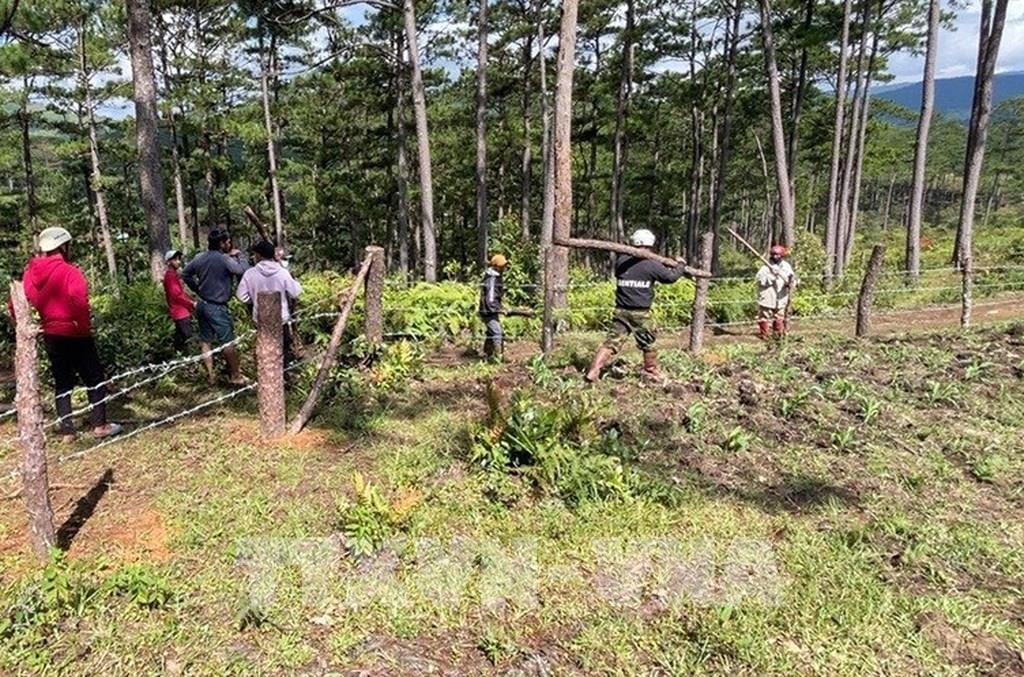Lực lượng chức năng huyện Lạc Dương giải tỏa 1 khu vườn lấn chiếm đất rừng. Ảnh: Chu Quốc Hùng - TTXVN