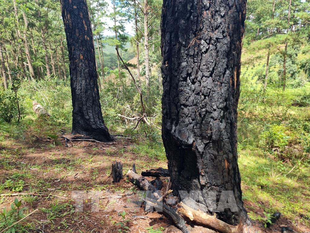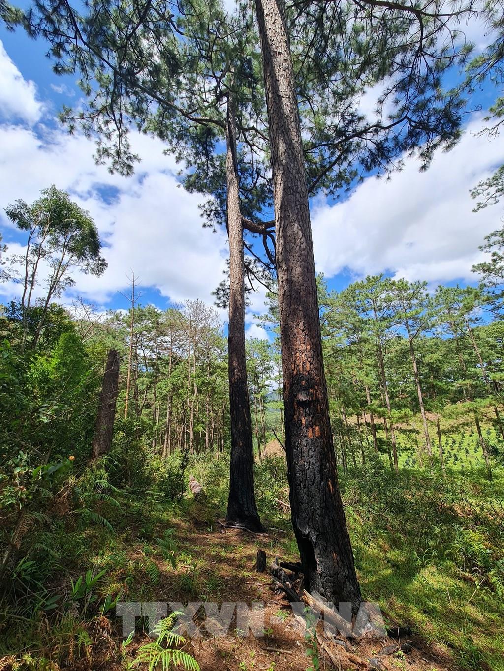 Những cây thông cổ thụ bị lâm tặc đốt gốc. Ảnh: Chu Quốc Hùng - TTXVN