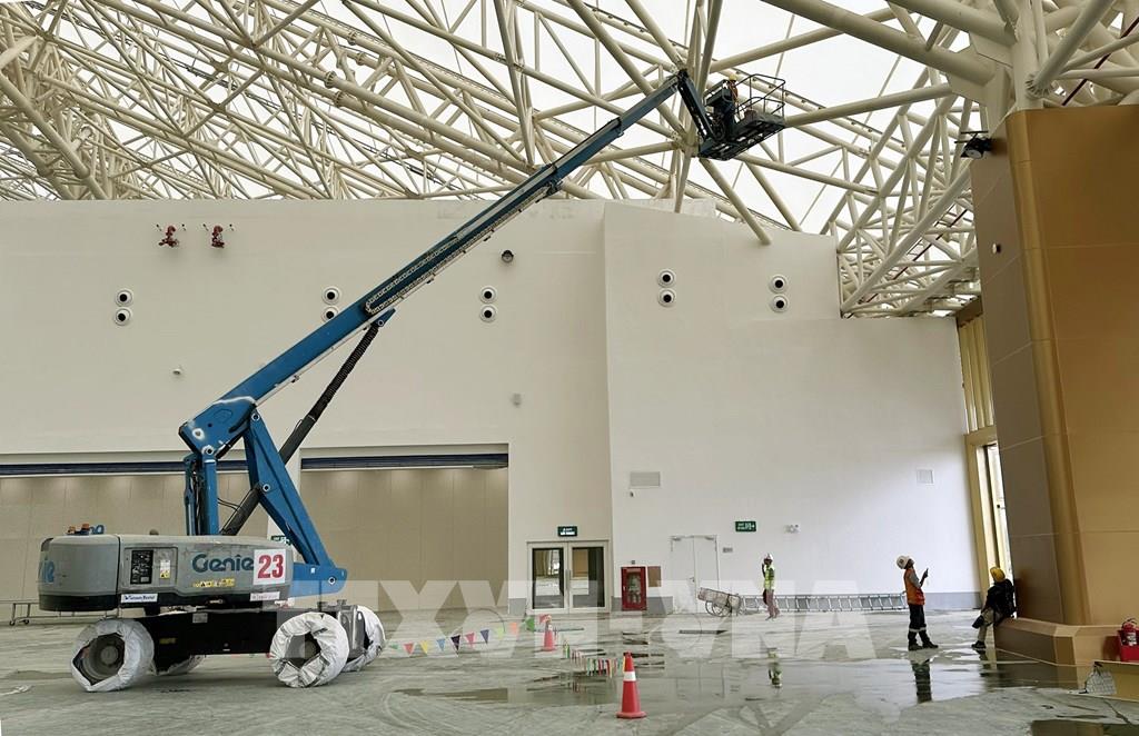 Nhà thầu kiểm tra hệ thống vòm mái thép bên trong khu vực nhà triển lãm Kim Quy. Ảnh: Quốc Khánh - TTXVN