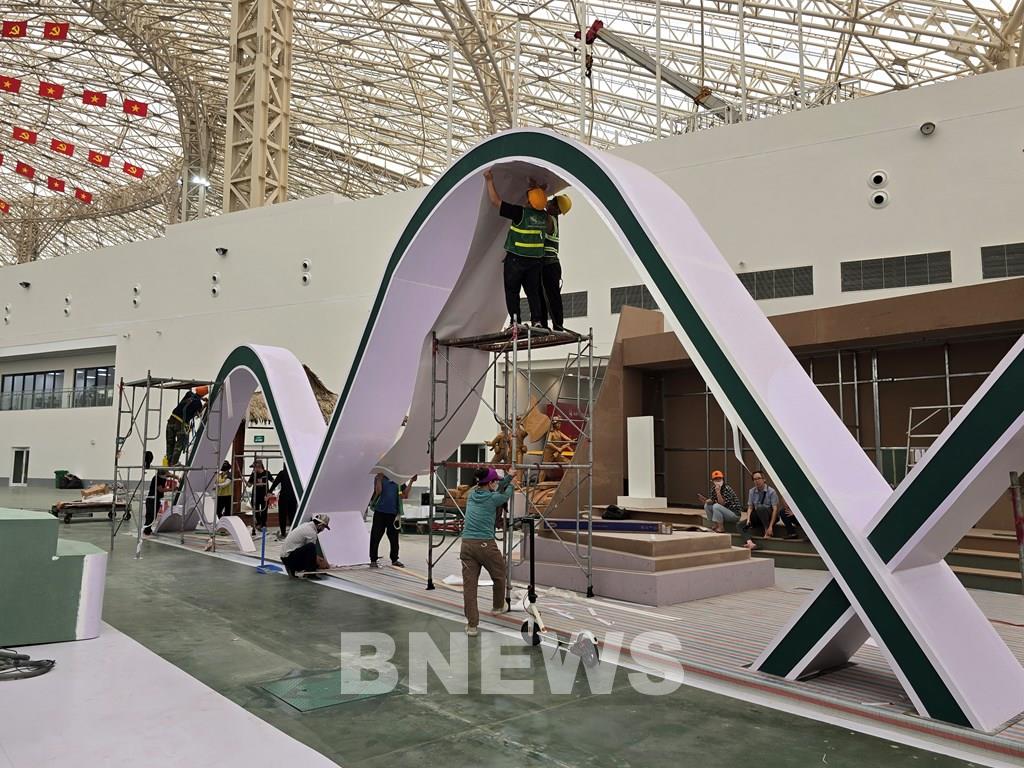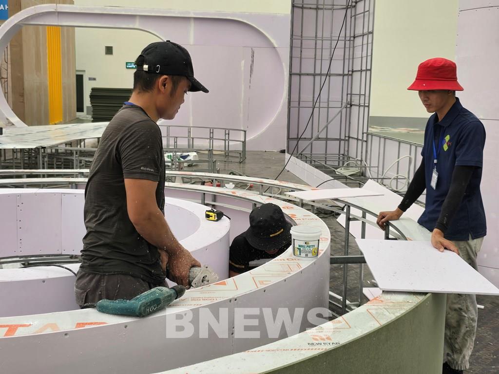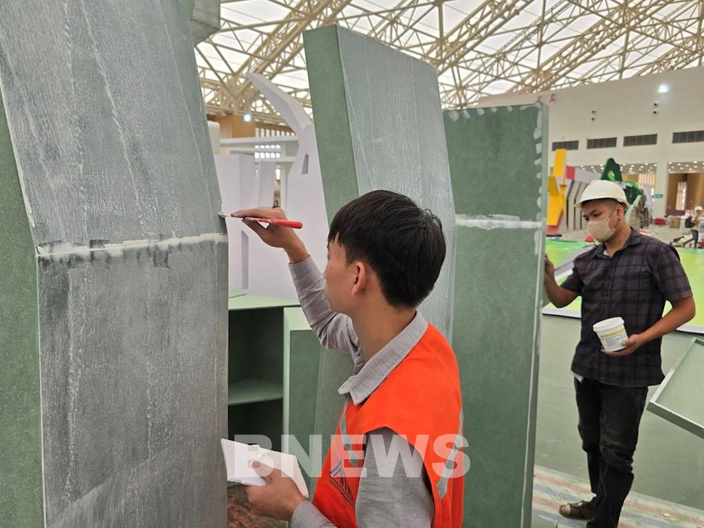 Công nhân đang gấp rút hoàn thiện mặt tiền gian hàng. Ảnh: Văn Xuyên/BNEWS/TTXVN