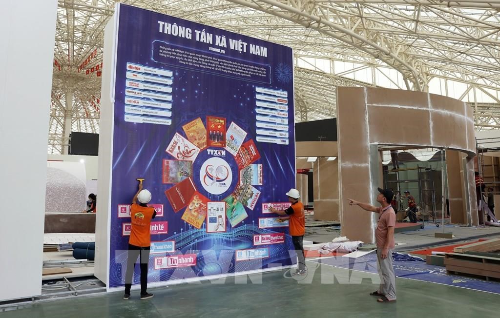 Thi công gian hàng triển lãm của Viện Hàn lâm Khoa học xã hội Việt Nam. Ảnh: Văn Xuyên/BNEWS/TTXVN
