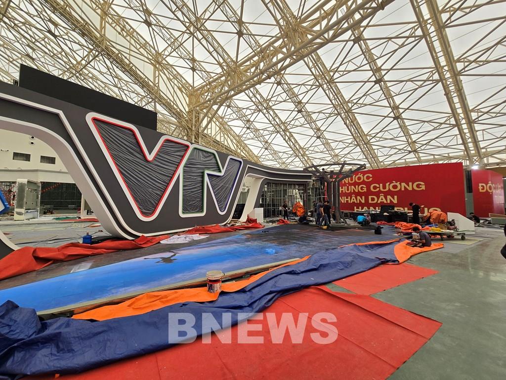 Bên trong mái vòm thép là các gian hàng của tham gia triển lãm. Gian trưng bày của Thông tấn xã Việt Nam được thi công khẩn trương, phục vụ cho lễ khai mạc Triển lãm thành tựu đất nước nhân dịp kỷ niệm 80 năm Quốc khánh. Ảnh: Quốc Khánh - TTXVN
