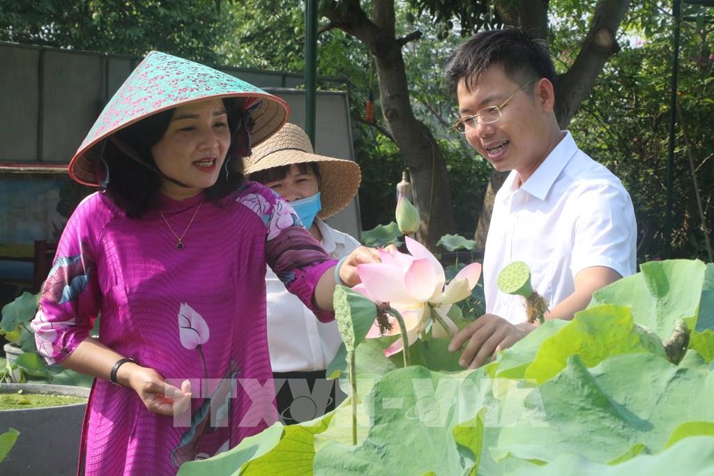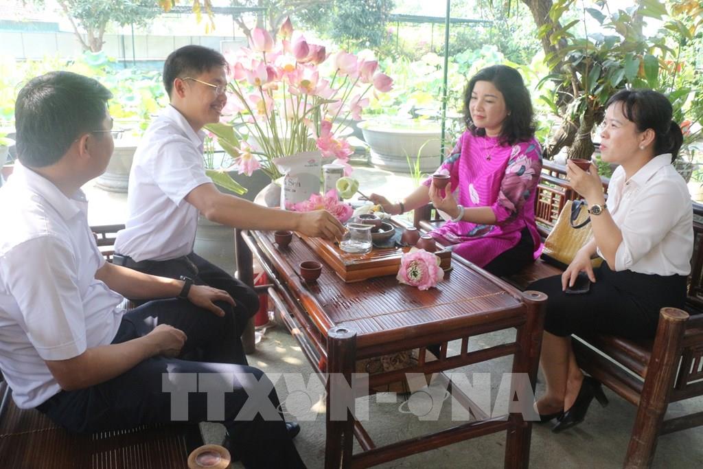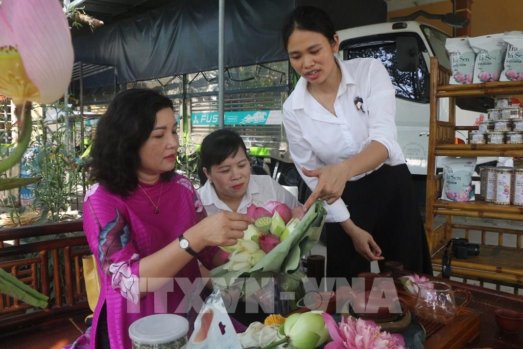 Du khách được tham gia trải nghiệm các khâu kỹ thuật trồng, thu hoạch, chế biến sen và thưởng thức nghệ thuật ẩm thực và tham quan mua sắm các sản phẩm từ sen. Ảnh: Bích Huệ - TTXVN