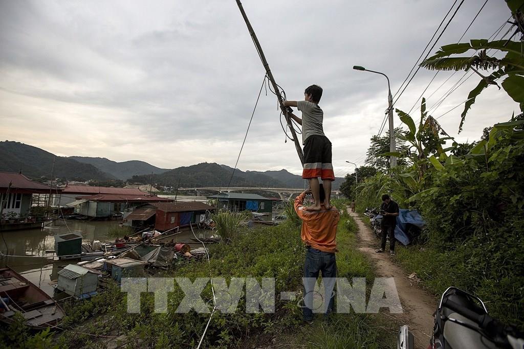 Hình ảnh hai bố con người dân làng vạn chài kéo và sửa đường dây điện ngay trên bến sông. Ảnh: Trọng Đạt - TTXVN