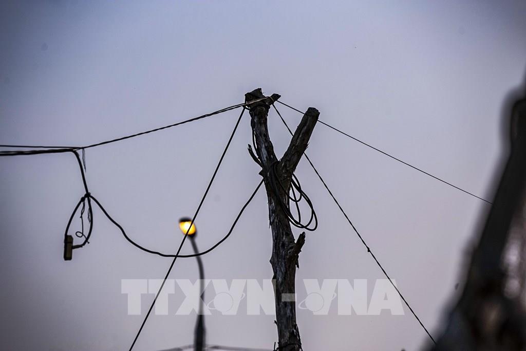 Dây điện chằng chịt lằng nhằng được chống đỡ bằng các thân tre tạm bợ nơi làng vạn chài ngay dưới chân cầu Hòa Bình 3. Ảnh: Trọng Đạt - TTXVN
