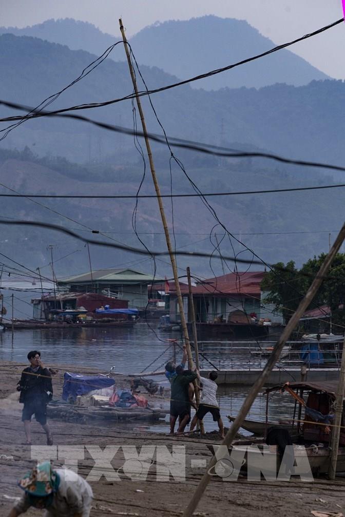 Hầu hết các cột chống dây điện bằng tre luồng đều do người dân làng vạn chài chung sức dựng ngay trên bến sông mỗi khi nước sông Đà xuống thấp. Ảnh: Trọng Đạt - TTXVN