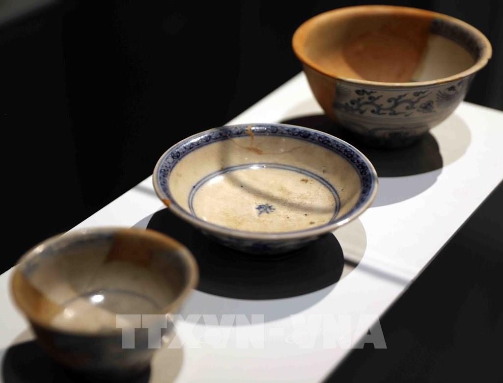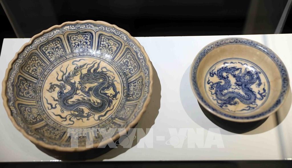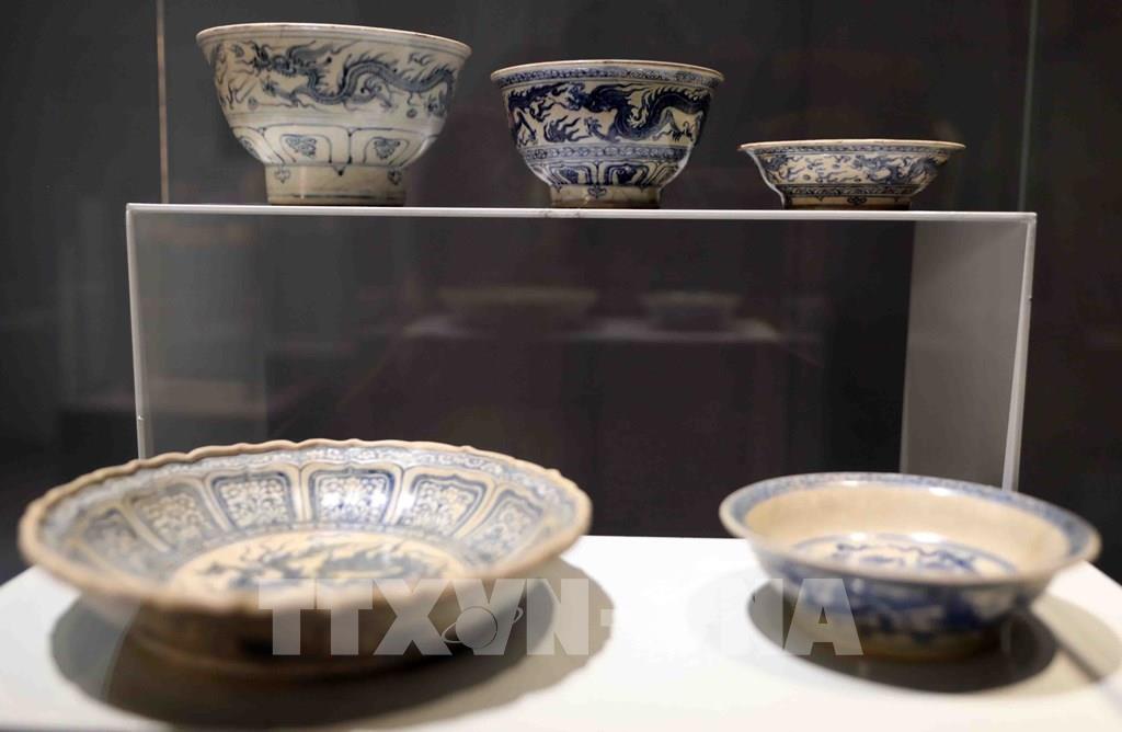 Sưu tập bát, đĩa gốm hoa lam ngự dụng thời Lê sơ, niên đại: Thế kỷ XV - đầu thế kỷ XVI; hiện lưu giữ tại Trung tâm Bảo tồn Di sản Thăng Long - Hà Nội. Ảnh: Thanh Tùng - TTXVN