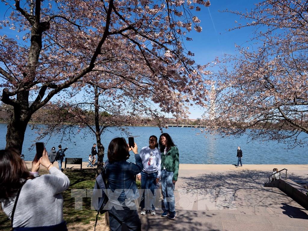 Du khách chiêm ngưỡng vẻ đẹp của hoa anh đào tại Washington DC (Mỹ). THX/TTXVN