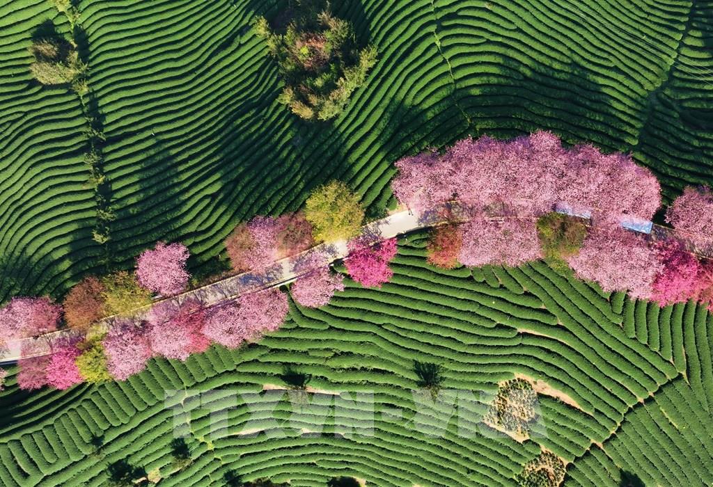 Sắc hồng của hoa anh đào chen lẫn màu xanh ngát của vườn chè tại thành phố Chương Bình, tỉnh Phúc Kiến, Trung Quốc. THX/TTXVN