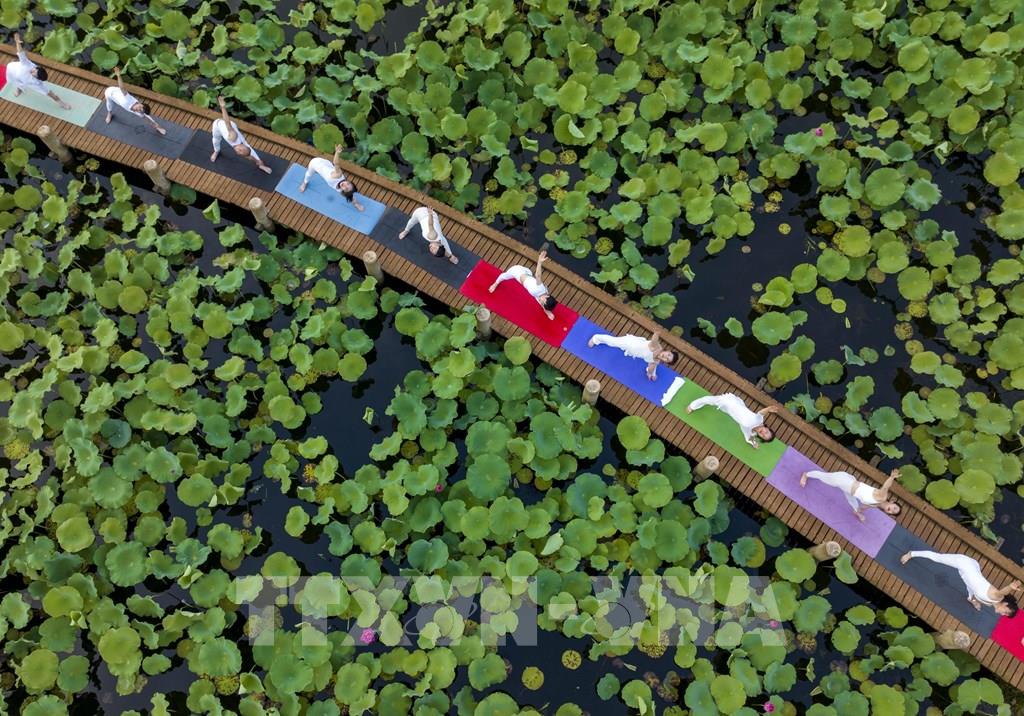 Một nhóm du khách tham gia lớp học Yoga bên hồ sen ở Thái Châu. Ảnh: THX/TTXVN