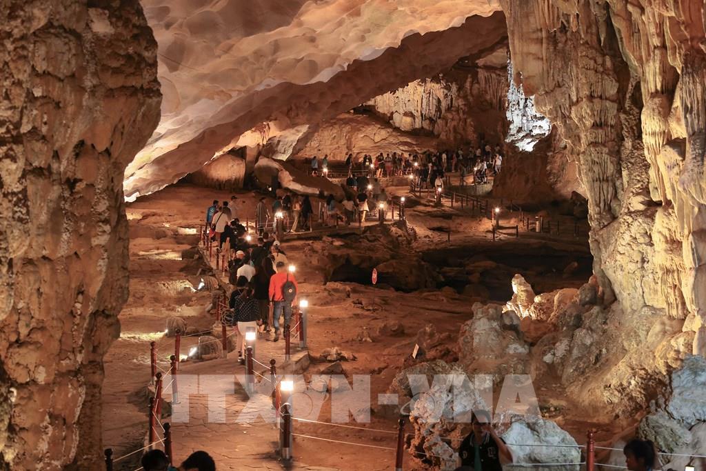 Du khách tham quan hang Luồn trên Vịnh Hạ Long. Ảnh: Hoàng Hiếu - TTXVN