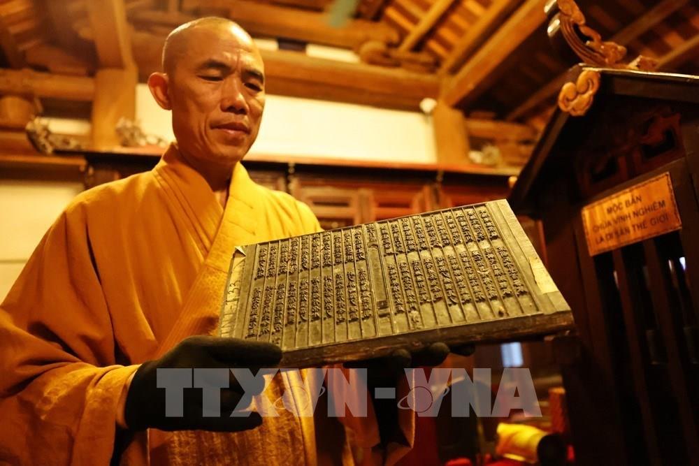 Mộc bản chùa Vĩnh Nghiêm được khắc bằng chữ Hán và chữ Nôm với nhiều kiểu chữ khác nhau như chân thư, thảo thư, lệ thư, hành thư,... Nhiều trang được các nghệ nhân xưa khắc đan xen thêm những bức minh họa đường nét tài hoa tinh tế, bố cục chặt chẽ, hài hòa, xứng đáng là tác phẩm đồ họa có giá trị thẩm mỹ cao. Ảnh: Minh Đức – TTXVN