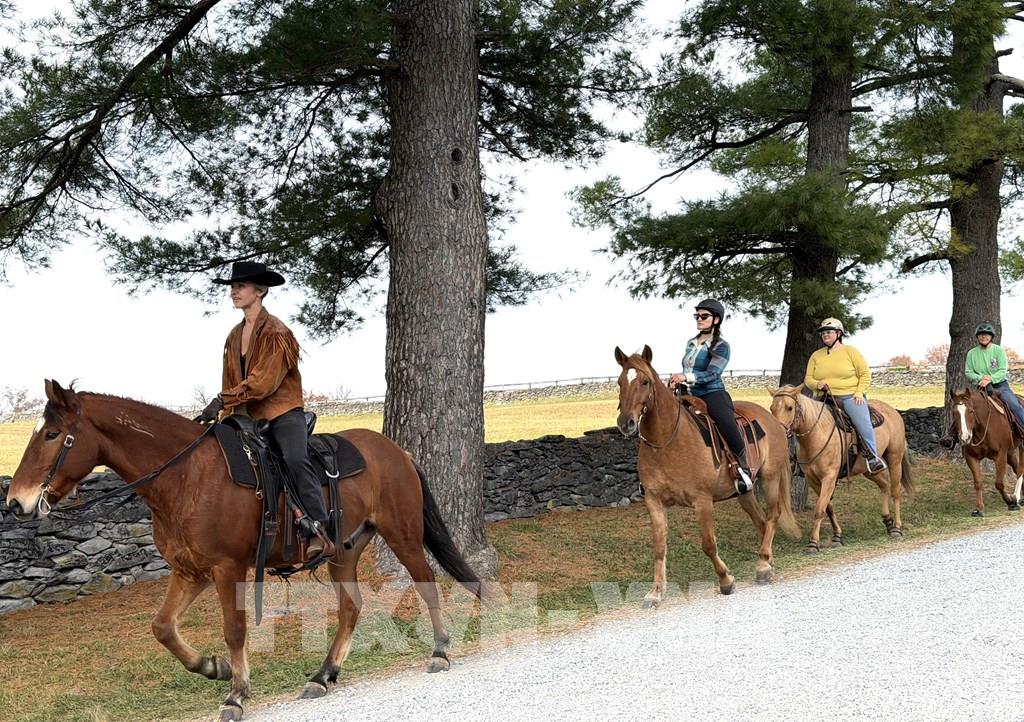 Du khách cưỡi ngựa trên lối vào Ginkgo Grove, cảm nhận mùa Thu vàng rực giữa rừng bạch quả cổ thụ. Ảnh: Ngọc Quang-PV TTXVN
