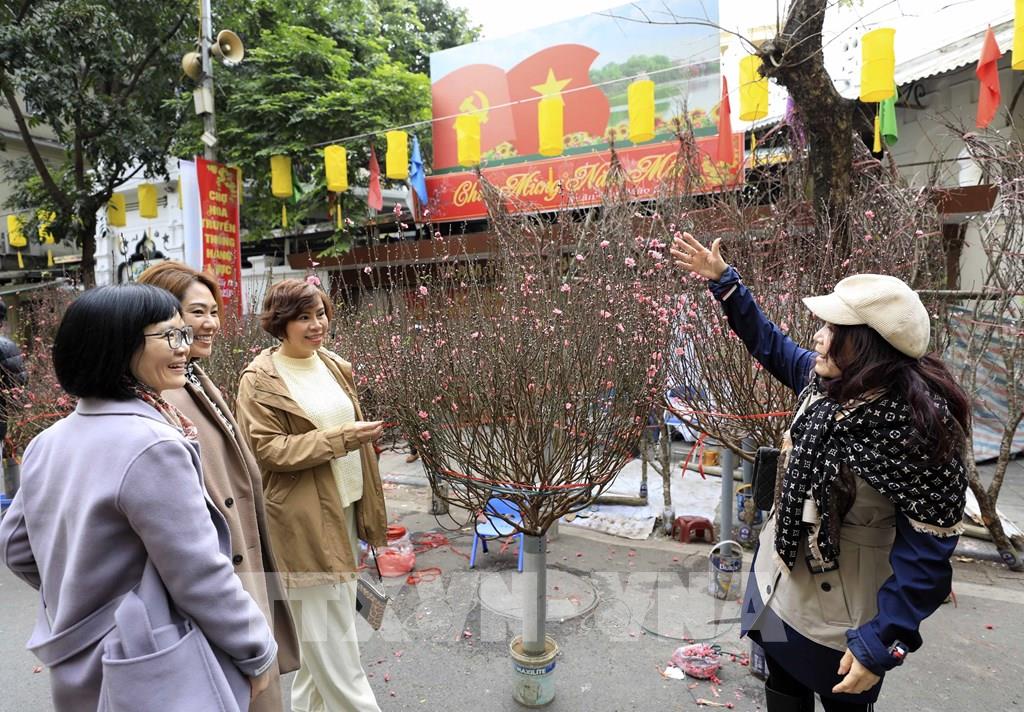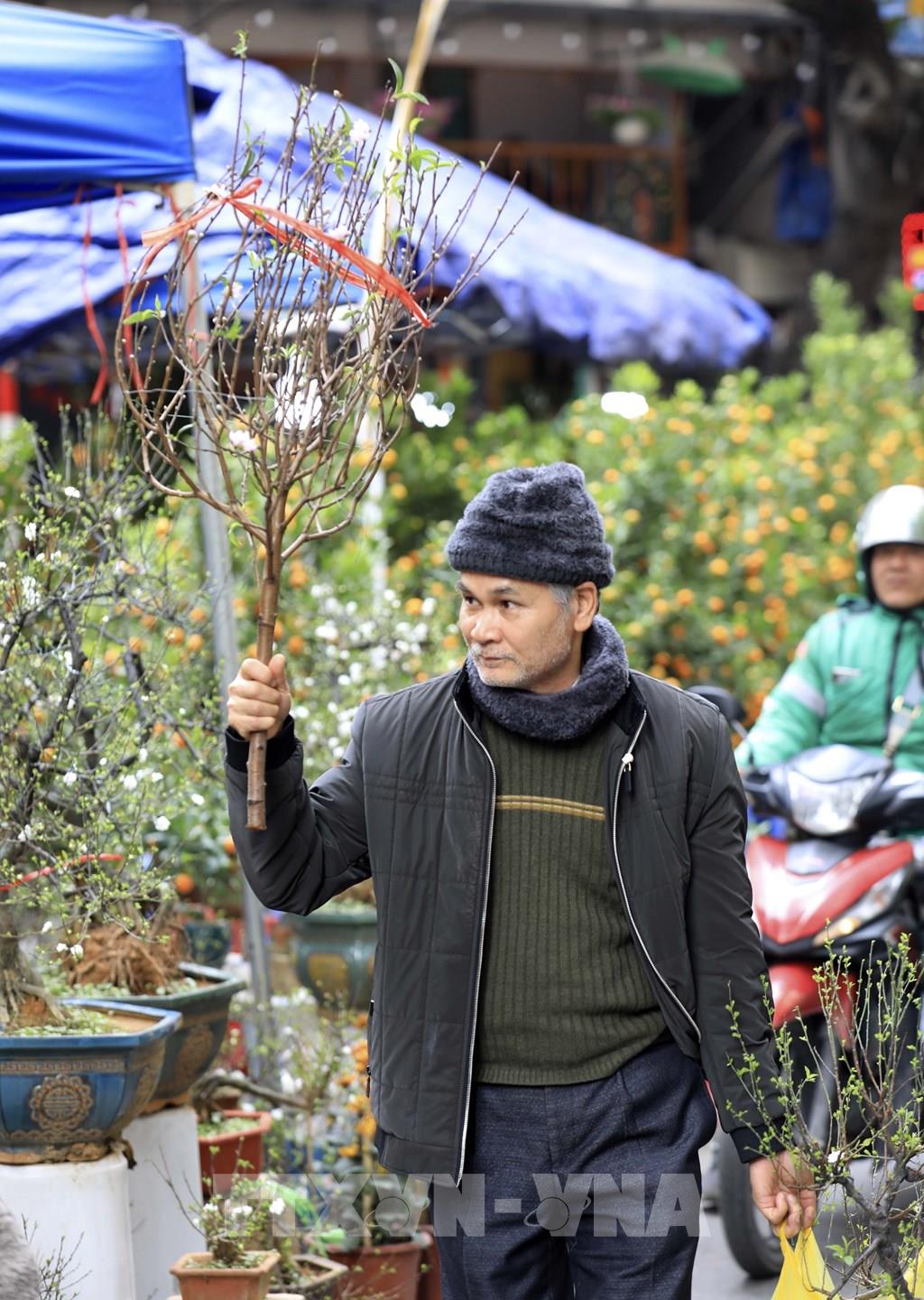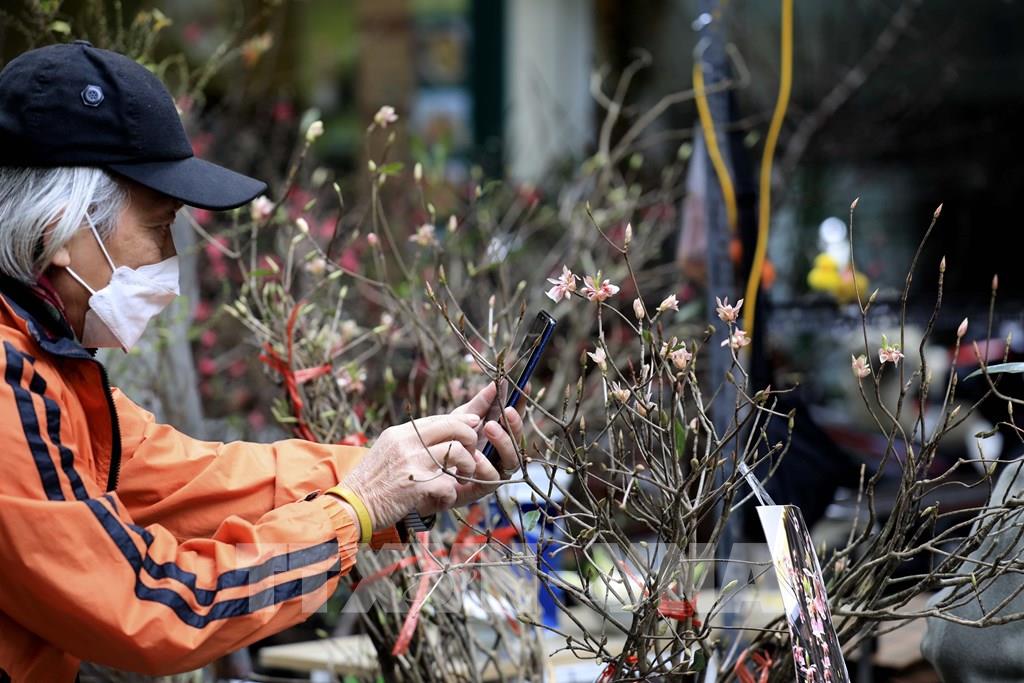 Chọn mua một cành đào nhỏ cắm Tết là niềm vui của người dân Hà Nội. Ảnh: Nhật Anh - TTXVN