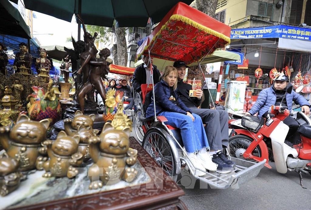 Du khách thích thú với cung đường tham quan qua chợ hoa Hàng Lược. Ảnh: Nhật Anh - TTXVN