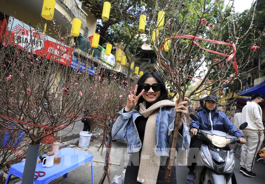 Chụp ảnh với cành đào vừa mua được. Ảnh: Nhật Anh - TTXVN
