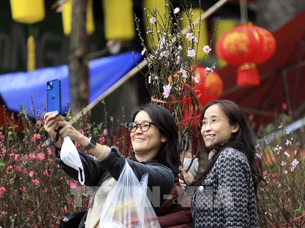 Nhiều bạn trẻ dạo chơi chợ để lưu lại những hình ảnh đẹp của cá nhân dịp Tết đến Xuân về. Ảnh: Nhật Anh - TTXVN