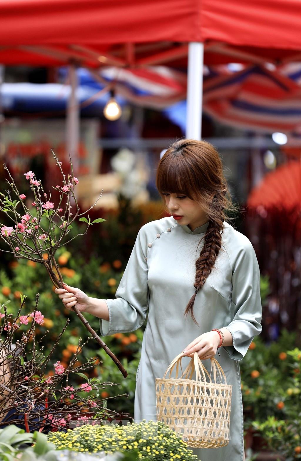 Thiếu nữ Hà Thành dạo chơi chợ hoa chiều 25 tháng Chạp. Ảnh: Nhật Anh - TTXVN
