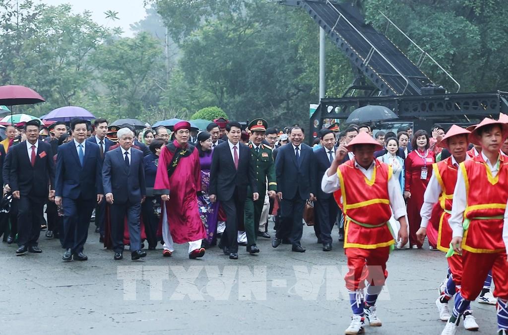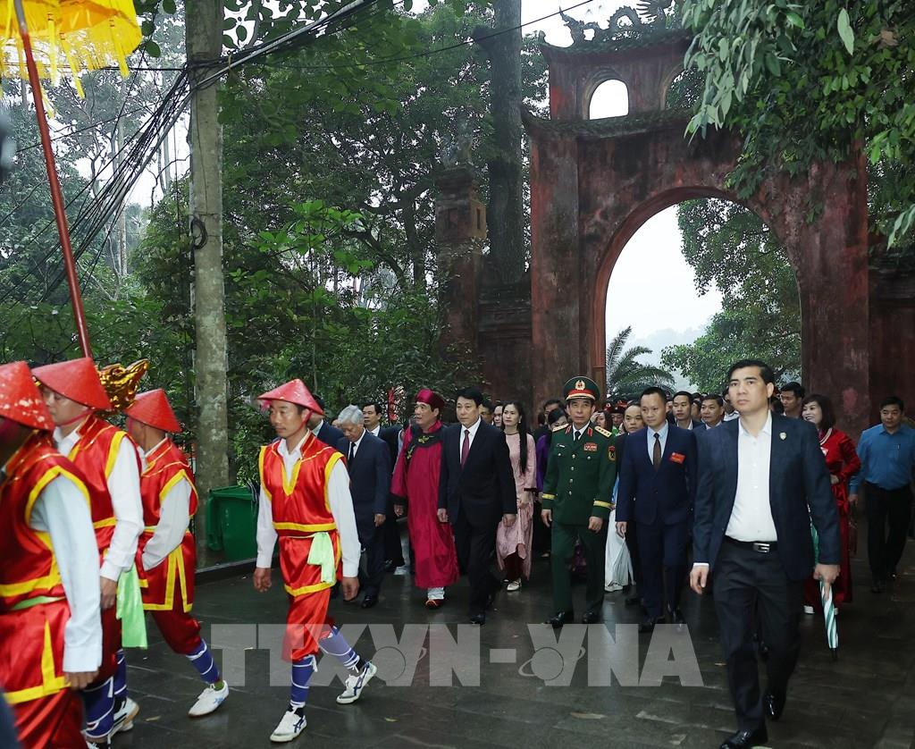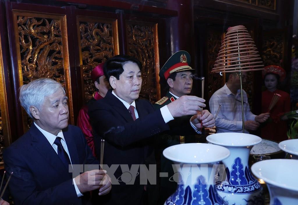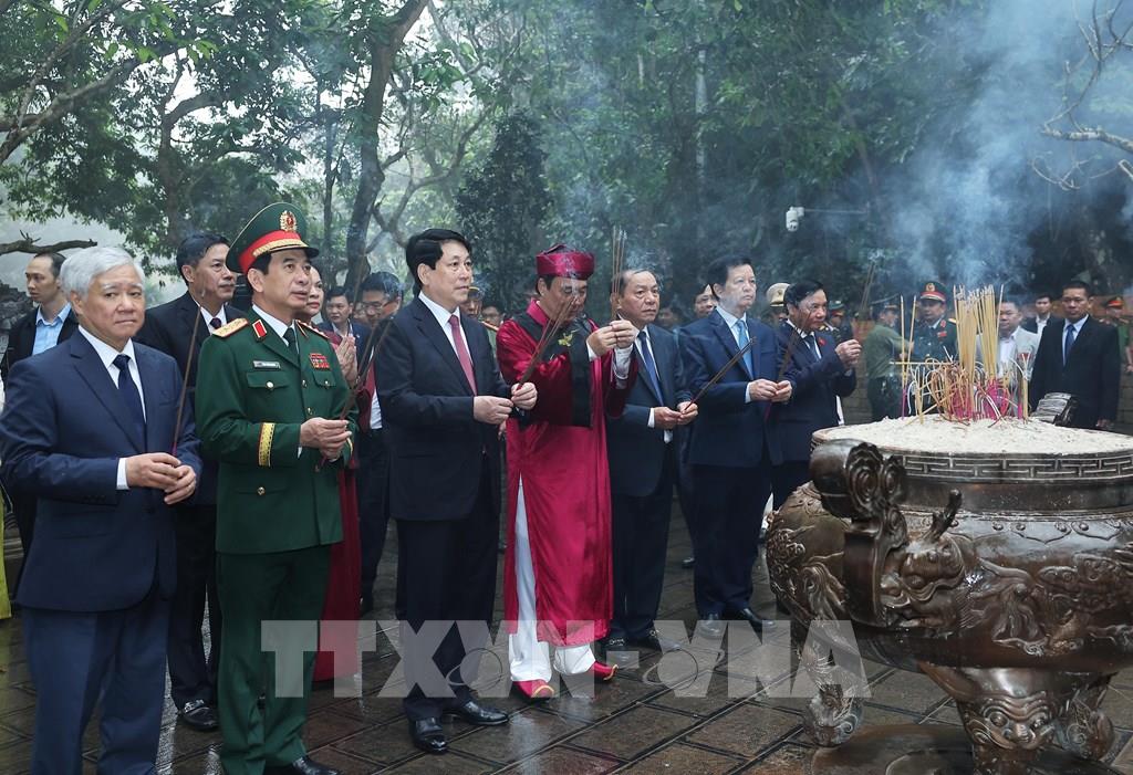 Chủ tịch nước Lương Cường cùng lãnh đạo Đảng, Nhà nước dâng hương tại Đền Thượng trong Khu di tích lịch sử Quốc gia đặc biệt Đền Hùng. Ảnh: Lâm Khánh – TTXVN