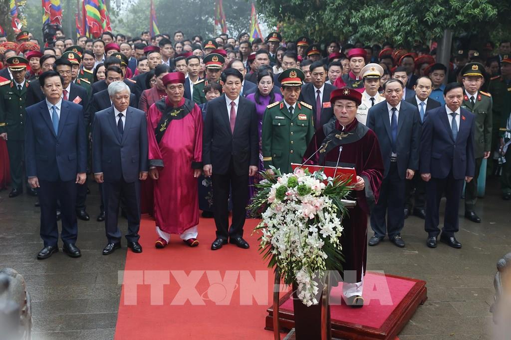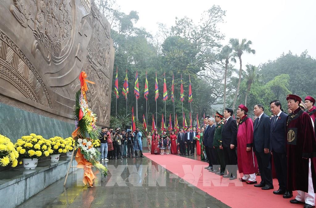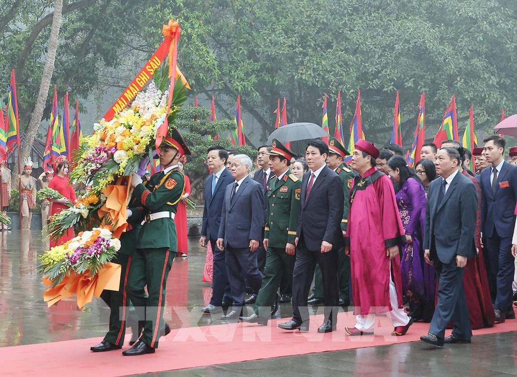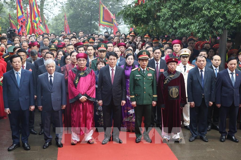 Chủ tịch nước Lương Cường cùng lãnh đạo cấp cao của Đảng, Nhà nước dự Lễ dâng hương tưởng nhớ, tri ân công đức các Vua Hùng. Ảnh: Lâm Khánh – TTXVN