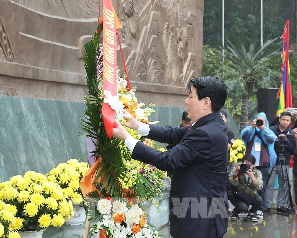 Chủ tịch nước Lương Cường dâng hoa trước Bức phù điêu "Bác Hồ nói chuyện với cán bộ, chiến sĩ Đại đoàn Quân Tiên Phong" tại Ngã năm Đền Giếng. Ảnh: Lâm Khánh – TTXVN