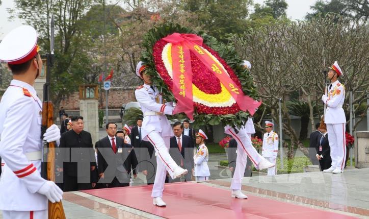 Trước khi rời Hà Nội đi Lạng Sơn, Chủ tịch Triều Tiên Kim Jong-un đến đặt vòng hoa tại Đài tưởng niệm các Anh hùng liệt sĩ trên đường Bắc Sơn, Quận Ba Đình. Ảnh: Thành Đạt - TTXVN