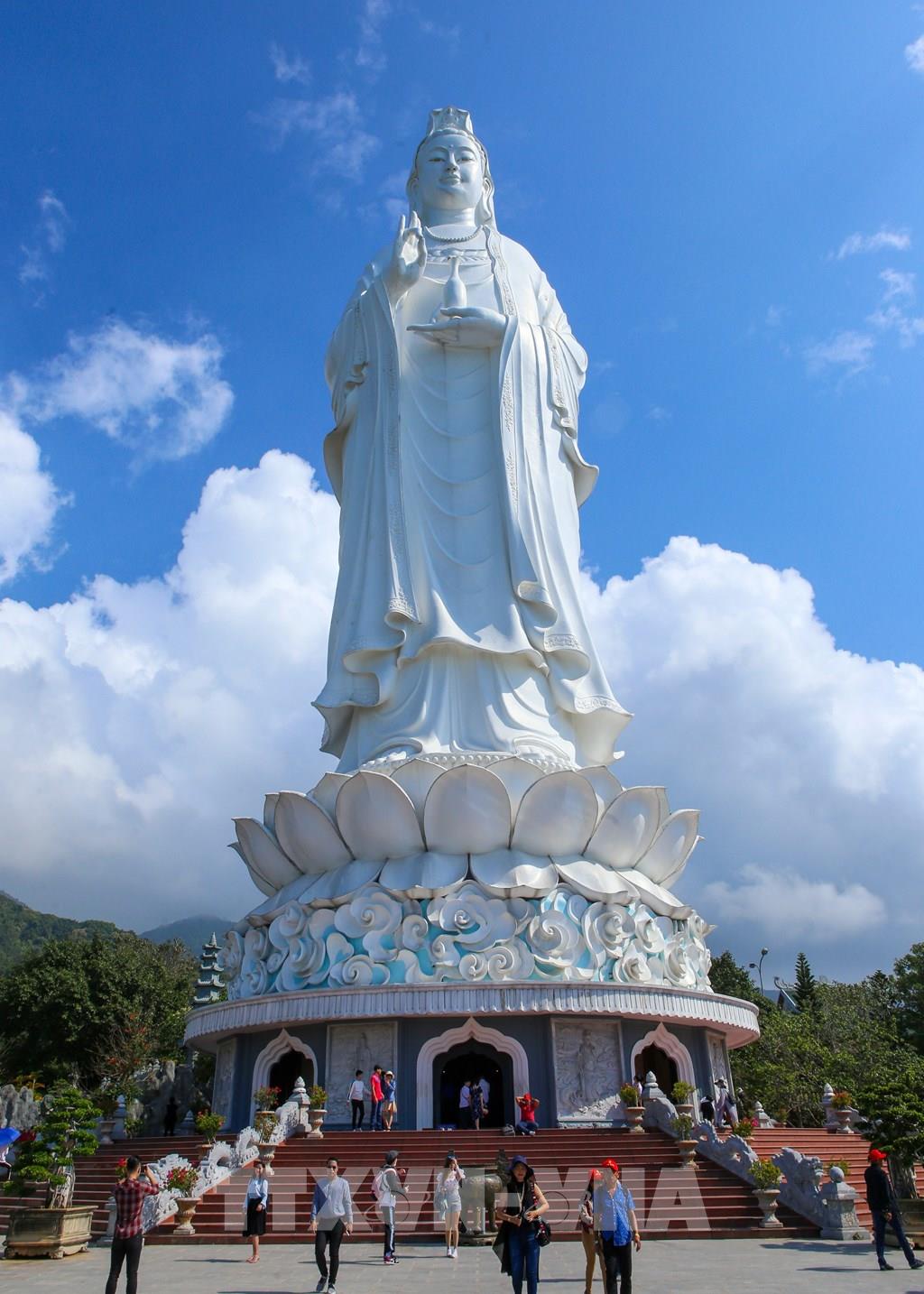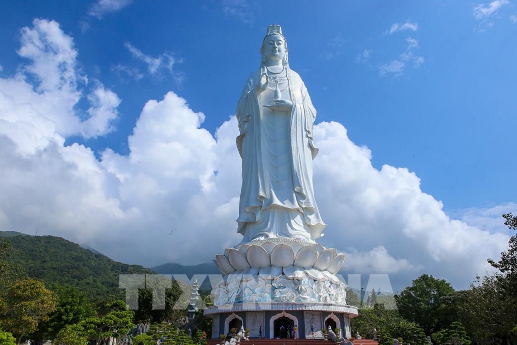Thánh tượng Bồ Tát Quán Thế Âm với chiều cao 67m, đường kính tòa sen dưới chân tượng 35m là điểm nhấn độc đáo trong Quần thể Chùa Linh Ứng - Bãi Bụt. Ảnh: Trần Lê Lâm - TTXVN\