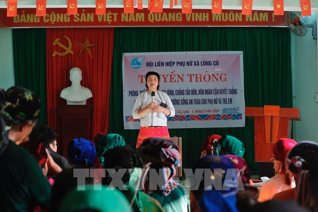 Ngoài nhiệm vụ là cô đỡ thôn bản, chị Vừ Thị Mỷ (thôn Cẳng Tằng, xã Lũng Cú, huyện Đồng Văn) còn kiêm nhiệm làm Trưởng thôn, Chi hội trưởng phụ nữ thôn, thường xuyên tuyên truyền, phổ biến pháp luật đến bà con trong xã. Ảnh: Minh Quyết - TTXVN